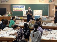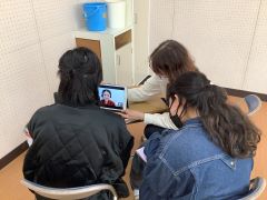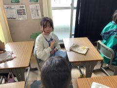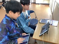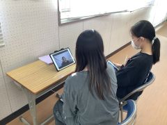 6年生の外国語でオンラインブレンディッドを行いました。オンラインでつないだタブレット端末を4台使用し、児童が外国の方に都道府県を英語で紹介しました。観光名所やその土地の名産などを、英語で紹介できるように調べたことを伝えていました。