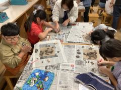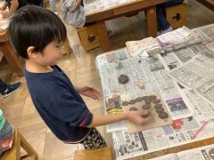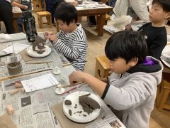 はじめに、型抜きをしたパーツを作り、その後にお皿やコップ、置物など思い思いに形作り、その作品にパーツをつけていきました。それぞれ思いが込められていて、とても熱心に作業をしていました。焼き上がりが楽しみです。