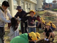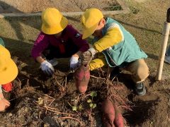 手でいものまわりの土を掘って、いもを傷つけないようにていねいに収穫しました。一人では抜けず3人がかりで引っ張る巨大なさつまいももありました。