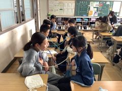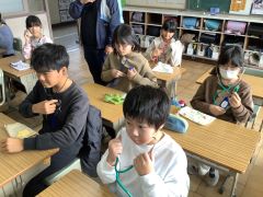 全員が聴診器で、自分の心音が聞こえてくることに驚いていました。自分の心拍を計ったり、近くの児童同士で心音を確認し合ったりしていました。