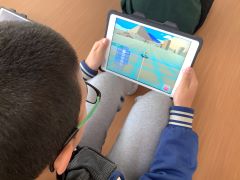 6年生は、算数の授業でプログラミングを行いました。今日の課題は、1辺50cmの正方形を描くようにドローンを飛ばすです。タブレット端末で、「離陸」や「前50cm」などの指示ブロックでプログラムを組みシミュレーションを画面上で行い、うまく作動してから実際にドローンを飛ばしました。