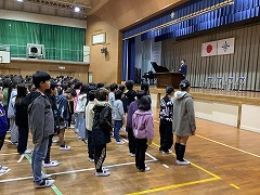 今日の朝会で、4,5年生は2月6日の音楽会で演奏する合唱「COSMOS」を全校に披露しました。