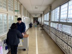 岩滑小学校の多くの担任は、一人一人にがんばったことを伝えながら廊下で渡しています。